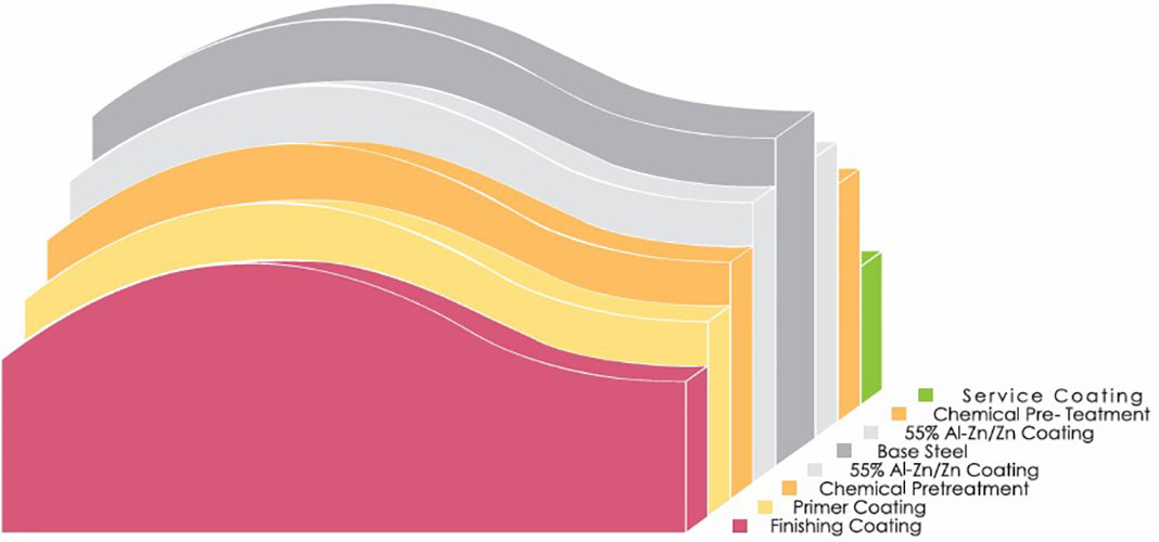 The Steel Panel is corrugated from Pre-Painted Steel Sheet whose base materials has minimum thickness of 0.42mm (Base metal thickness, BMT) & Yield Strength 550MPa made out of cold rolled steel and shall be coated with anti corrosive layer of hot dip metallic Aluminium-Zink alloy coating of Aluminium (55%) & Zinc (45%).